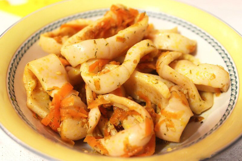 Вкусный острый салат из кальмаров кулинарный рецепт с пошаговыми фото Ингредиенты в кулинарном рецепте: Рецепт с фото и пошаговым приготовлением острого салата из кальмаров: Шаг 2 Морковь чистим, трем на терке, выкладываем на разогретую сковороду с маслом. Добавляем кунжут, пропущенный через пресс чеснок, паприку. Перемешиваем и готовим на сильном огне 4-5 минут, постоянно помешивая. Шаг 3 Добавляем кальмары, мелко порезанную зелень, солим и готовим на сильном огне 4-5 минуты, пока кальмары не станут белыми Шаг 4 Сразу перекладываем из горячей сковороды в тарелку, иначе кальмары станут жесткими. Идеально с рисом. Приятного аппетита !