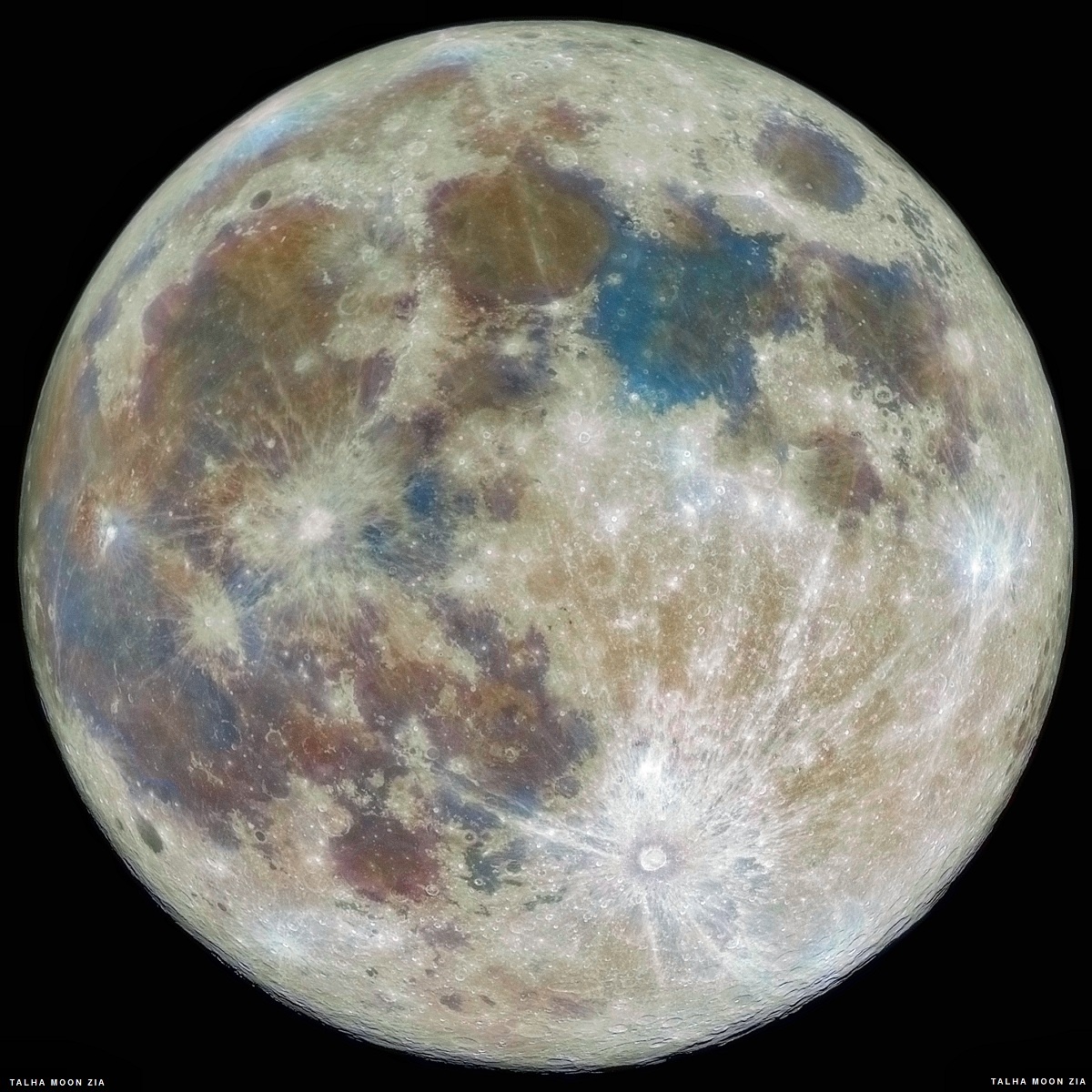 Прошлой ночью можно было наблюдать луну на максимально близком расстоянии к Земле, чем и воспользовались многие астрономы и обычные наблюдатели неба фотографируя супер- луние. Эту фотографию сделал астроном-любитель из города Карачи, Пакистан. Как можно видеть цвет Луны совсем не серый и она достаточно разноцветная. Для получения цветного изображения Луны не потребовалось никакого фильтра. Цвета естественно присутствуют на спутнике Земли и нужно только немного повысить уровни цвета в Photoshop, чтобы увидеть настоящий цвет Луны. "Я сложил 43 одиночных изображения для повышения отношения сигнал / шум, - говорит Зия, - затем я увеличил уровни цвета, чтобы получить окончательную фотографию" Что означают эти цвета? Синий обозначает области, богатые титаном, в то время как оранжевый там где его мало. Зоны, богатые титаном, особенно интересны тем, что лунный титан связан с кислородом - например, в лунном минерале ильмените. Этот кислород может быть легко извлечен, обеспечивая будущих иссл