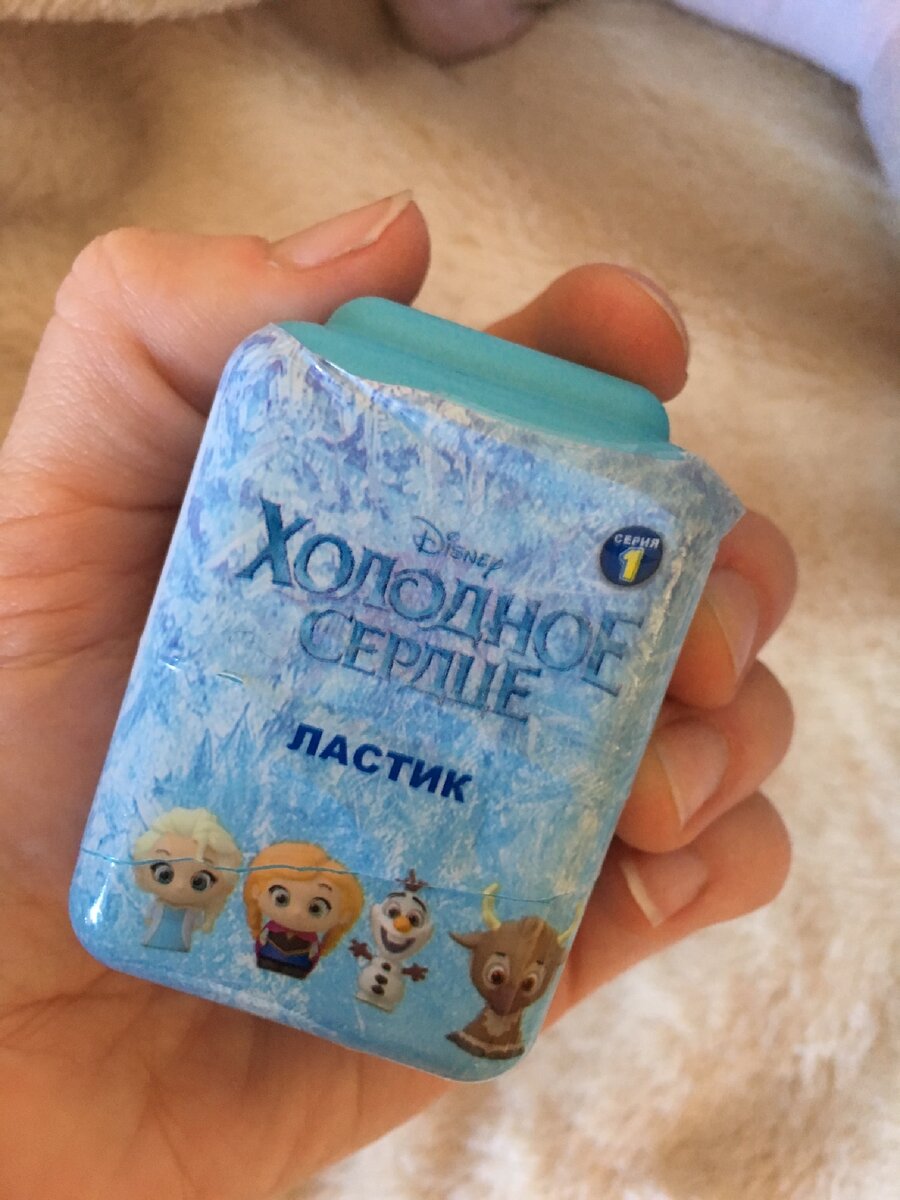 Купила стирательную резинку, ластик за 99 рублей «Холодное сердце». Изначально, когда шла в магазин, цели купить стирательную резинку не было, тем более, такую дорогую. Просто дочка увидела около кассы красивые голубые коробочки и сразу схватила одну, подумав, что там игрушка. Признаюсь, я тоже изначально так решила, что в коробке игрушка. Купили в Магните за 99 рублей. И только придя домой, я заметила слово «ластик». Вот такая коробочка. Внутри резинка - игрушка из популярного мультика. Открываем... Зачем-то в коробочку положили целых два вкладыша с информацией о коллекции ластиков - игрушек, которую можно собрать. Вот эти вкладыши. Судя по другим ластикам из коллекции, нам очень повезло, что попалась именно Эльза. На картинке видно, что игрушка Анна тоже очень симпатичная, но остальные четыре стирательных резинки девочке были бы совершенно не интересны, было бы большое разочарование. Ожидаешь принцессу, а получаешь пару странных снеговиков, да ещё и за такие деньги, 99 рублей в со
