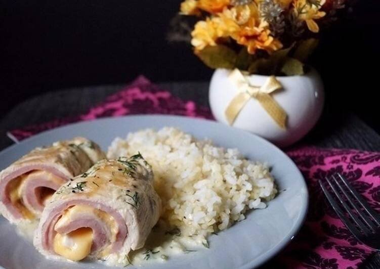 -Соль, перец по вкусу Способ приготовления: Сыр нарезаем ломтиками. Ветчину режем тонкими слайсами. Куриную грудку разрезаем вдоль на 3 пластика. Каждый пластик отбиваем кулинарным молотком или тупой стороной лезвия ножа. Подсаливаем. Сверху на каждый пластик укладываем 2 слайса ветчины. На ветчину укладываем ломтики сыра.