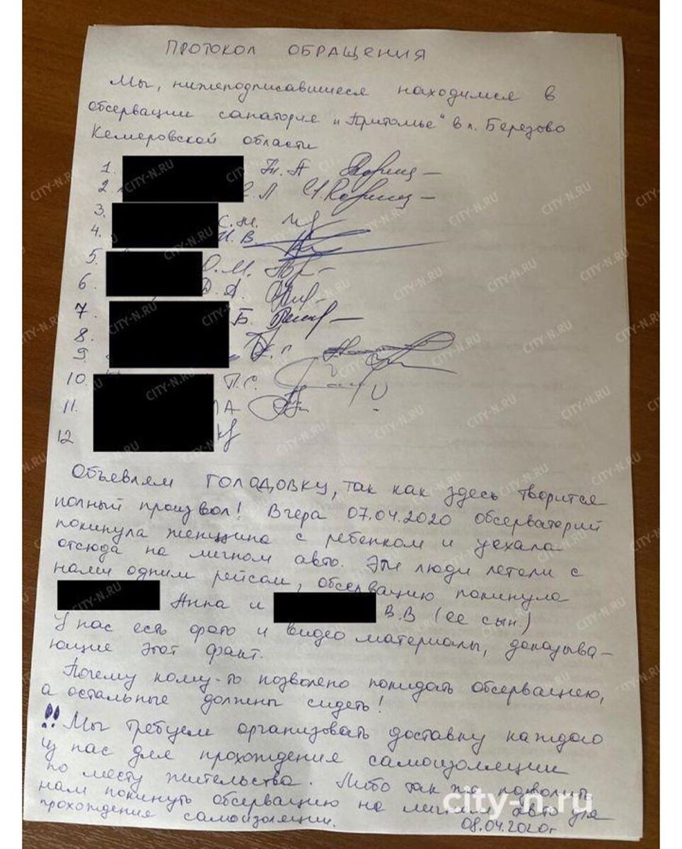 Изолированные Новокузнечане объявили голодовку. Люди,которых оставили в обсервации на 2 недели,написали обращени к кузбасским властям. Участники акции протеста и непосредственно изолированные в санатории "Притомье"жители Новокузнецка не могут добится вразумительного ответа на единственный вопрос:по какому праву их лишили свободы? На представленном видео показано,как находящиеся в обсерваторе люди пытаются выяснить,почему жителей других регионов отвезли на самоизоляцию по месту жительства в Красноярск,Томск и др.,а новокузнечан оставили в "Притомье"на 2 недели. Сотрудники не говорят,по чьему распоряжению их оставили в обсервации,кто принял такое решение,к кому обратится за разъяснением-ссылаются на какие-то мифические приказы. Люди доведены до нервного срыва из-за вопиющей несправедливости и чьего-то явного самоуправства. Поясним:согласно постановлению главного санитарного врача по Кемеровской области от 05.04.2020 года за N 9 "О введение дополнительных мероприятий по предотвращению нов