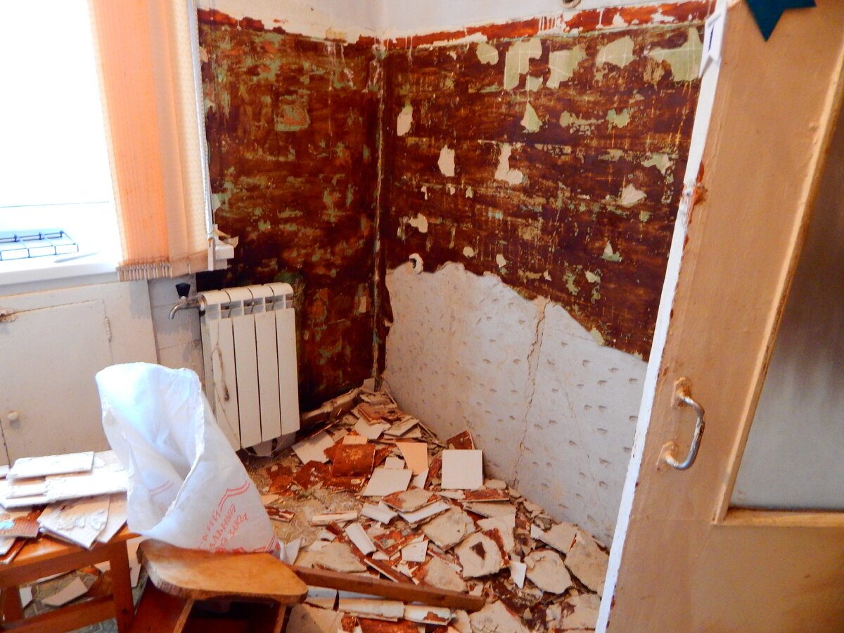 Добрый день, с вами Наталья. Ну что, продолжаем ремонт квартиры? Итак, зашли мы в нее, все оценили, сразу решили ровнять полы, натягивать потолок , менять проводку, объединять ванную с туалетом, так как вход в ванную был со стороны кухни, а нам не хотелось терять целую стену в малипусенькой кухне, оставляя там дверь. А я время от времени бегала на балкон , подышать воздухом и очередной раз полюбоваться на вид из окна... Обои размочили и сняли, под ними были слои покраски, побелки, да разного цвета...ух ты, весело...Все счистили. Вообще снести и счистить, сорвать, хотелось все, этот ужасный запах, запах старого жилья и плесени....бббррр..... На кухне сбивали плитку, как же смешно и удивительно ее клеили раньше, без выравнивания в плоскости, без одинаковых швов между плитками, где-то 5 мм, где-то совсем без шва. Такое впечатление , что ее клеили ногой, левой...Мусор набирался и копился очень быстро, этаж пятый, лифта конечно