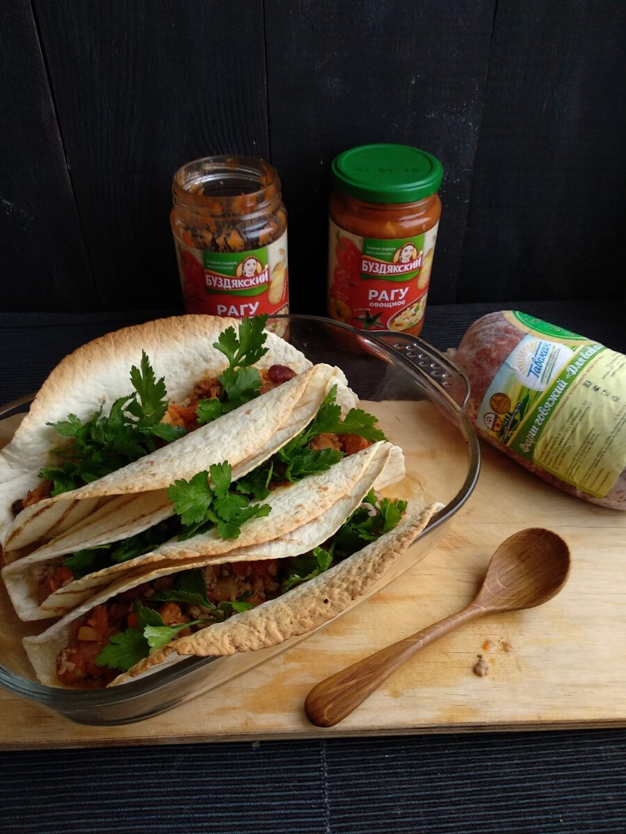 ТОРТИЛЬИ с мясом и овощным рагу Нам понадобятся следующие продукты: -мясной фарш говяжий - 400 г
