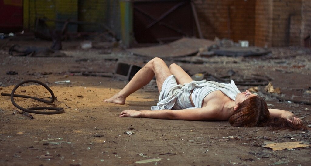 Женщина лежит вроде в бессознательном состоянии. С сильными неполадками в одежде и с прической. Видать, стала жертвой грабителей и насильников.