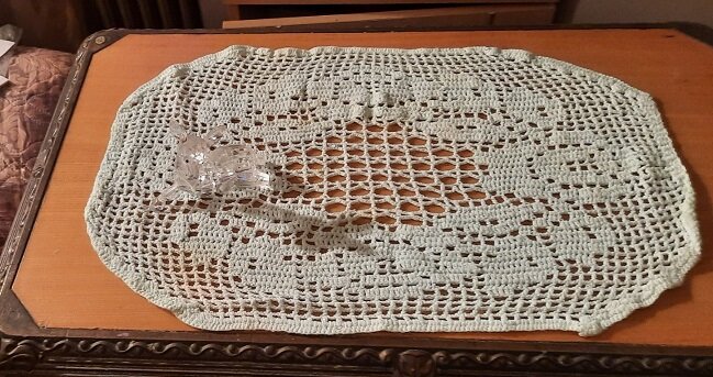 Салфетка с рисунком венок из розочек Связала крючком, новую оригинальную модель филейным узором Я только начинающий любитель, только пробую свои силы в рукоделии.Но у меня почему-то получилась салфетка не квадратная, а продолговатая, Даже еще и лучше, мне понравилась, красивее смотрится на журнальном столике.Вязала я салфетку примерно неделю вечерами по 3 часа. Размер окружности салфетки 40 х 41 см. Мне понадобилось 70 г. голубоватой хлопчатобумажной пряжи (200 м/50 г) Крючком я вязала No 1,5 Описание работы: Вывязала крючком цепочку из 85 воздушных петель + 4 воздушные петли подъема.И дальше я вязала салфетку по счетной схеме филейным узором. Для 1 пустой клетки-вяжем 1 ст.с2/н. и 2 воздушные петли. Для 1 заполненной клетки 3 столбика с/2н. Каждый ряд начинаем с 4 воздушных петель. Вместо 1-го столбика с/2н и заканчиваем 1 столбик с/2н в воздушную петлю подъема предыдущего ряда.Прибавление 1 заполненной клетки: в начале ряда 7 воздушных петель подъема, по 1 столбику с/2н в 6 и 7 во