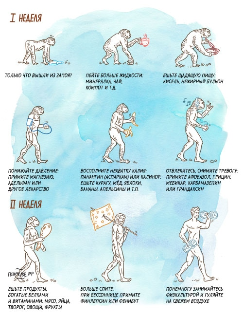 Когда говорят о быстром выводе из запоя на дому, обычно имеют в виду детоксикацию организма. Существуют домашние и аптечные средства и медикаменты, которые могут временно облегчить состояние больного. Важно помнить, что они не заменяют врачебной помощи, а просто разряжают обстановку и дают возможность дождаться завершения опьянения. Обильное питье, нежирный бульон, кисломолочные продукты, витамины группы B способствуют выводу токсинов, а настойка пустырника и экстракт валерианы снимают тревожность. Чтобы восстановить организм после запоя, надо: В первую неделю: Во вторую неделю: НЕ ВКУСНО, НО ИНТЕРЕСНО Гороскоп на 10 апреля 2020 для всех знаков Зодиака Почему в доме ломаются вещи и техника Как носить медицинскую маску, чтобы не запотевали очки