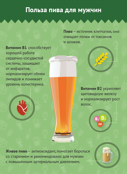 Пиво является древнейшим напитком, который стал невероятно популярным в наши дни. Особенную страсть к такому виду алкоголя питает сильная половина общества, ведь как приятно провести время за бутылочкой хмельного питья в компании друзей. Мало кто задумывается, что польза от пива для организма мужчин минимальна, а вот частое распивание подобного напитка ведет к быстрому привыканию. Польза живого пива для здоровья мужчин Не смотря на вред от пива, который подобная продукция несет для мужчин, напиток обладает уймой полезных веществ. К примеру, витамин В1 способствует работе сердечно-сосудистой системы на должном уровне, а В2 укрепляет щитовидную железу и нормализирует рост волос. Кроме этого, фенольные соединения, присутствующие в пивной продукции, защитят от инфарктов, нормализируют обмен липидов и понизят уровень холестерина. Бутылочка хмельного напитка перед сном поможет расслабиться, избавив от бессонницы. Такое «лекарство» полезно только в случае редкого употребления пива, для взр