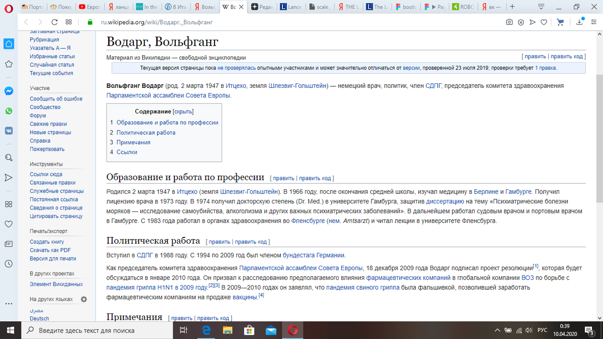 Вольфганг Водарг - бывший председатель комитета здравоохранения парламентской ассамблеи совета Европы. В 2010 призвал к расследованию, предполагаемого, влияния фармацевтических компаний в глобальной компании ВОЗ по борьбе с пандемией гриппа H1N1. Затем заявил, что пандемия свиного гриппа была фальшивкой, позволившей заработать фармацевтическим компаниям на вакцине свиного гриппа.