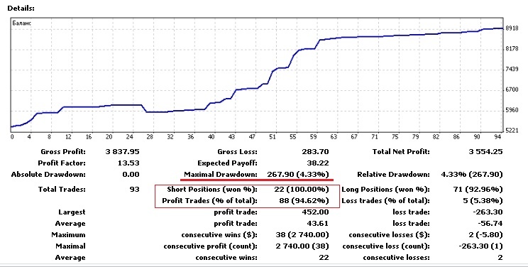 Споры не утихают и по сей день. Кто то утверждает что это лохотрон и развод. Кто то, говорит что ему удалось построить империю с доходностью превышающий заработную плату министра. Верны оба этих мнения. Человек не умеющий управлять автомобилем, не должен сидеть за рулем не только частного авто, но и управлять транспортным средством общего пользования. Надеюсь с этим согласны все? Хочу показать один скрин. Осень интересно как вы к нему отнесетесь? Это так называемый отчет из программы, для работы на форекс. МТ-4. Она формирует статистику работы трейдера за определенный период времени. По которой можно отследить насколько успешны были действия трейдера. На представленном скрине нам интересны некоторые параметры работы счета. А именно. Максимальная просадка. Этот параметр указывает нам насколько глубоко счет уходил в отрицательную зону. Видим мы, 4,3 % Второй показатель отмеченный на скрине, это. Количество успешных позиций. Тех которые были закрыты с профитом. В обеих направлениях торгов