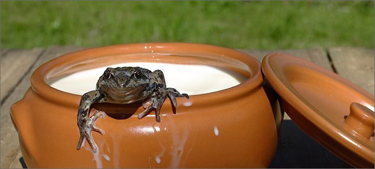 Однажды две лягушки свалились в горшок с молоком и стали тонуть. Тонуть им, конечно, не хотелось, тогда они стали барахтаться что есть мочи.Но у этого горшка были очень высокие скользкие стенки и лягушкам оттуда никак не выбраться. Одна из лягушек поплавала немного, побарахталась и думает:«Все равно мне отсюда не выбраться.Зачем же я буду напрасно барахтаться?Только мучиться зря, лучше сразу утонуть».Подумала она так, перестала барахтаться – и утонула. А вторая думает: «Нет, утонуть я всегда успею.А лучше я еще побарахтаюсь .Может быть, что-нибудь и выйдет».И вот из последних сил борется храбрая лягушка со своей лягушачьей смертью. Уж вот она и сознание стала терять, захлебываться.Уж вот ее ко дну тянет. А она и тут не сдается и продолжает лапками работать.Дрыгает лапками и думает: «Нет! Я так просто не сдамся!..»И вдруг чувствует, что под ногами у нее уже не молоко,а что-то твердое, что-то такое крепкое, надежное, вроде земли.Удивилась лягушка, посмотрела и видит: никакого молока в
