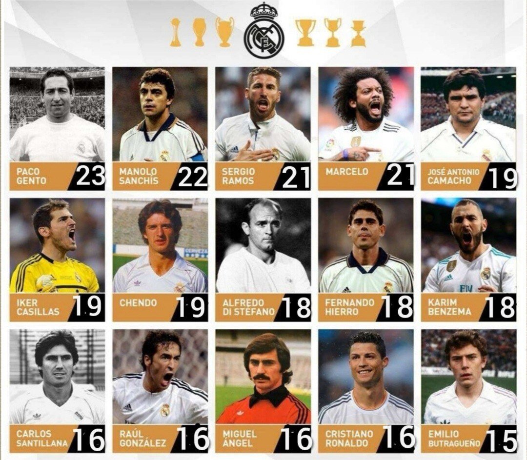 Приветствую болельщиков Реал Мадрида и любителей футбола! Предлагаю Вашему вниманию ознакомиться с легендарными игроками кто выиграл наибольшое количество титулов в истории «Реал Мадрида». Ниже список самых титулованных игроков «Реал Мадрида»: 1. Франсиско Хенто: 23 трофеев; 2. Мануэль Санчис: 22 трофея; 3. Серхио Рамос и Марсело: 21 трофей; 4. Камачо, Чендо и Икер Касильяс: 19. Трофееев; 5. Альфредо Ди Стефано, Фернандо Йерро и Карим Бензема: 18 трофеев; 6. Сантиллана, Рауль, Мигел Ангел, Криштиану Роналду: 16 трофеев. 7. Бутрагеньо: 15 трофеев. Помните историю родного клуба, помните легенд клуба. Hala Madrid)