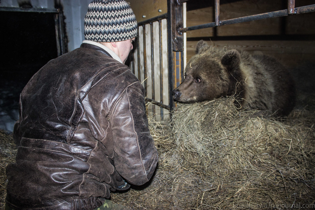 Это очень интересный момент в жизни медведя. Медведь не впадает в анабиоз. У него снижается метаболизм организма, он сам перестаёт есть и залегает в подготовленную берлогу. При этом находится в состоянии дрёмоты. В зависимости от температуры окружающей среды, медведь старается выполнять терморегуляцию. Мы организовали берлогу для Мансура на базе 20 футового морского контейнера, половина которого была обшита изнутри лиственницей и сосной, и застелена 1,5 м слоем соломы. Именно в этой соломе медведь делает себе лежанку.