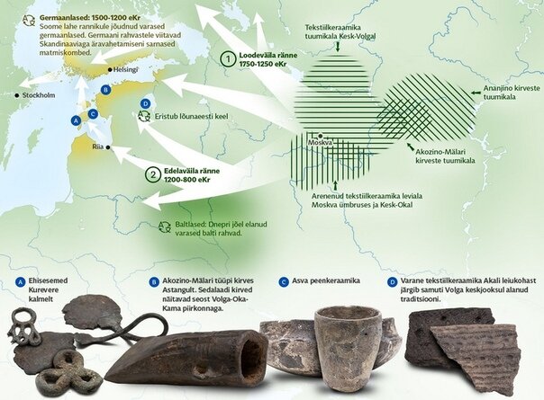 Великий путь от Волги до Эстонии. ВЕЛИКИЙ ТРЕК ОТ ВОЛГИ ДО ЭСТОНИИ Любопытная карта археолога Вальтера Ланга показывающая связь распространения прибалтийско-финских языков с распространением топоров акозинско-меларского типа, а также проникновения носителей прибалтийско-финских языков в Швецию на раннем этапе железного века. Вальтер Ланг с учетом мнения лингвиста Карла Паюсалу считает, что носители прибалтийско-финских языков проникли в Эстонию по Двине и побережью Балтийского моря; те, кто не дошел до Эстонии, сформировали южноэстонские языки; те, кто остался на территории Латвии, сформировали ливский язык. Далее прибалтийские финны поселились в Северной Эстонии, где смешались и ассимилировали носителей германских языков, далее во второй половиние 1 тыс. до н.э. проникли в Центральную Эстонию, потом по побережью Финского залива проникли в Финляндию, что во взаимодействии и смешении с саами, которые проникли из ареала текстильной керамики с первой волной миграции 1750-1250 лет до н.э
