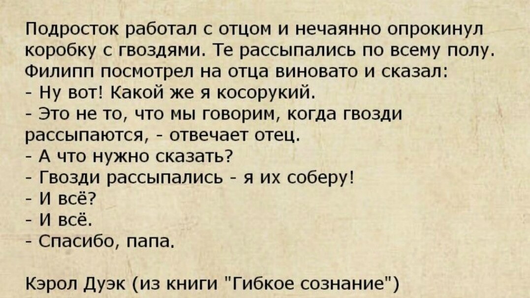 Думаю, что это нужно прочитать каждому, ведь грамотное общение с людьми всем пригодится. Да, тут будет суть конкретно в грамотном общении. Я вам покажу отрывок, потом мы его разберём. Есть ещё несколько моментов, которые я бы хотел обсудить. Ведь одного примера не достаточно, хотя это один из самых крутых примеров, что я видел, это действительно нужно читать каждому. Я не знаю, с каким воспитанием это связано. Но вы заметили, как у нас всё завязано на этих нелепых обвинениях? На каждом шагу за любую мелочь, хотя ничего серьезного не произошло. А если и произошло, то это уже произошло, поздно что-то делать и говорить. Ситуация лучше не станет. Я думаю, что это какой-то глупейший ход в области манипуляции. Если родители постоянно говорят такие вещи. Я имею ввиду, когда они находят причины, чтоб обвинять своих детей за любую мелочь. Возможно, это реально манипуляция. Чтоб ребёнок больше слушался, ведь он такой "плохой, криворукий и глупый". Мол, вот, родители то твои умнее, слушай толь