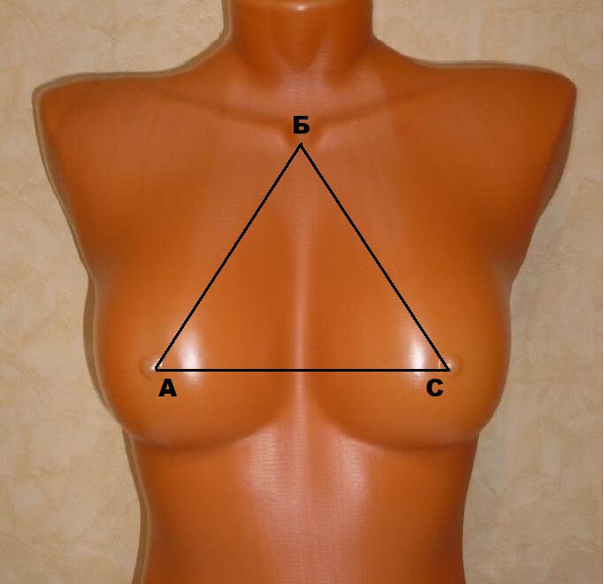 Понадобятся только ручка, листок и рулетка. Измеряем длину от соска А (отмечено на рисунке) до соска С. Полученную длину делим на 2. Далее измеряем длину от соска А до яремной вырезки (точка Б на рисунке). Теперь длину АС делим на длину АБ.