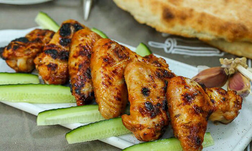 Куриные крылышки, замаринованные по этому рецепту, можно готовить и на шампурах, и на решетке гриль. Главное, выбрать подходящую температуру углей, чтобы мясо успело полностью приготовиться, но при этом корочка на крылышках была бы румяной, а не сгоревшей из-за присутствия в маринаде мёда. Для рецепта крылышек вам потребуется: · куриные крылышки — 1кг для маринада: · томатная паста или кетчуп — 4 ст.л. · мед — 1 ч.л. · французская горчица (мягкая) — 1 ст. л. · соевый соус — 2 ст. л. · масло растительное — 2 ст.л. · чеснок — 2-3 зубчика. Рецепт приготовления крылышек: Куриные крылышки для шашлыка помыть, дать воде стечь и промокнуть бумажным полотенцем. Крылышки для шашлыка можно разрезать по суставу на части, а можно оставить целыми. Мы выбрали второй вариант, отрезав только самый кончик крылышка, который может сгореть на мангале. Приготовить маринад. Для этого в большой миске смешать томатную пасту (или кетчуп), мед, соевый соус, измельченный чеснок и растительное масло. При