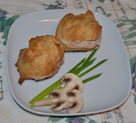 Рецепт впервые опубликован на сайте Gastronom.ru Разогреем духовку до 220 °C. Приготовим заварное тесто. Для этого вскипятим воду, добавим в нее соль и масло. Затем введем сразу всю муку и быстро замесим тесто венчиком или лопаткой. Продолжим замешивать на небольшом огне минуты 2-3. Дадим тесту немного остыть и введем яйца по одному, после каждого тщательно вымешивая тесто. На противень, застеленный пекарской бумагой, выложим 12 будущих булочек. Оставим между ними расстояние в пару сантиметров, так как профитроли увеличатся в объеме. Тесто удобно выкладывать на противень при помощи двух столовых ложек. Будем печь минут 15 (в зависимости от духовки) до подъёма и подрумянивания булочек, затем снизим температуру до 180-190 °C и доведем профитроли до готовности. Остудим в духовке на противне. Пока профитроли выпекаются, приготовим начинку. Для этого не до конца откроем баночки с тунцом и сольем в отдельную посуду сок, слегка вдавливая крышку внутрь банки. Отжатое филе тунца выложим