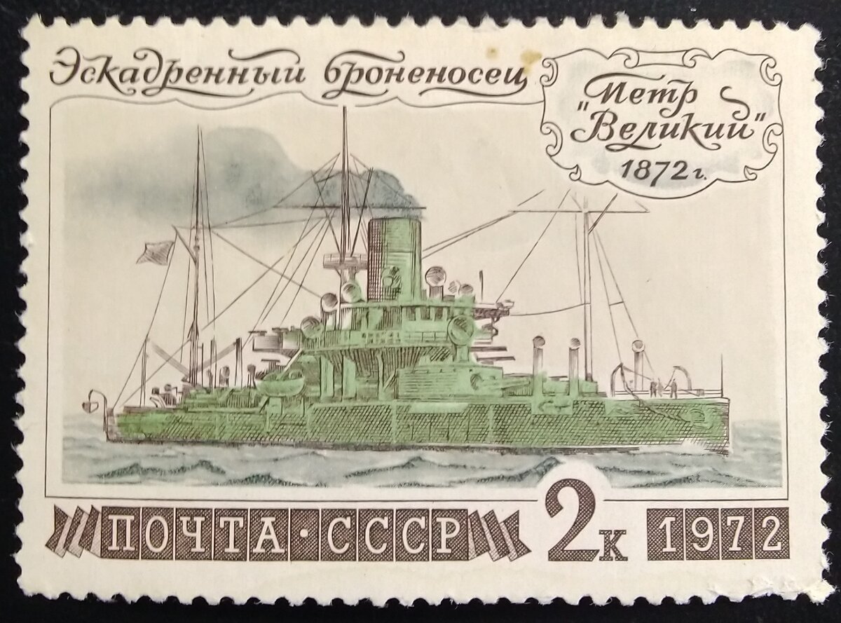 История отечественного флота в миниатюрах, на почтовых марках СССР 1972 года выпуска, глубокая печать в сочетании с металлографией на мелованной бумаге, №№ 4181 – 4184. Башенный эскадренный броненосец “Петр Великий”, заложен 20.05.1869 года, в г. Санкт-Петербург, спущен на воду 15.08.1872 года, в боевом строю с 1876 года. Водоизмещение 10105 тонн, размеры 100,6 х 19,3 х 7,6 метра, 6 двойных котлов, 2 винта, скорость 10,3 узла, запас угля 1200 тонн, дальность хода 1500 миль. Бронирование: борт в средней части 356-203 мм, в оконечностях 229-203 мм, бруствер 356 мм, башни 356 мм, палуба 76-63 мм. Экипаж 440 человек. Вооружение с 1907 года: 4-203-мм, 12-152-мм, 12-75-мм, 4-57-мм, 8-47-мм, 2-37-мм пушки. Бронепалубный крейсер «Варяг» 1 ранга, 1-ой Тихоокеанской эскадры ВМФ России. Участник единственного боя у Чемульпо в 1904 году. … в ходе полученных повреждений, в бою, офицеры корабля приняли решения о затоплении судна. Были открыты все переборки и крейсер был затоплен. Наверх, вы, тов
