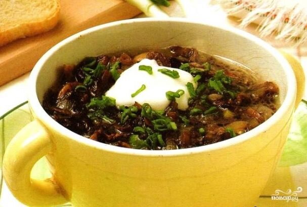 Сушёные грибы замачиваются в кипятке на два-три часа. Если кусочки большие, их можно измельчить обычными ножницами. В готовый мясной бульон с кусочками мяса, закладываются грибы вместе с кипятком, в котором они вымачивались. Морковь трется на средней тёрке, обязательно пассеруется в небольшом количестве жира. Пока она стоит на плите, очищенный картофель нарезается кубиками и закладывается в бульон. Лук можно запассеровать вместе с морковью. Обжаренные для мягкости овощи добавляются в суп. И вот здесь небольшой нюанс: для получения достаточно густого супа в него добавляют манную крупу. Манки требуется примерно четверть стакана на полтора литра супа. Всыпается она тонкой струйкой при интенсивном помешивании, чтобы не получилось комочков. Сразу же после добавления манной крупы нужно добавить сушёный укроп. Причём именно сушёный, а не свежий. Он даст неяркий, но характерный аромат, и сделает вкус грибного супа законченным. Ни в коем случае не стоит портить вкус такого супа свежей зеленью. Допускается лишь небольшое количество сметаны.
