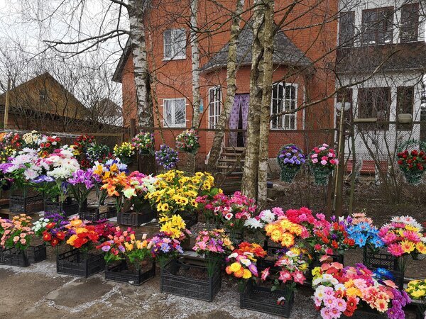 Недавно ездили на кладбище, сейчас сплошные праздники, да родительские субботы, нужно навещать родственников, ходить на кладбища. Заметила по дороге один интересный дом, который располагается недалеко от кладбища. да этот дом сложно не заметить, он выглядит ярко даже зимой благодаря цветам и венкам. Хозяева, пользуясь тем, что кладбище буквально в 400-500 метрах находится, сделали бизнес по продаже искусственных цветов. Судя по хорошему добротному кирпичному дому, бизнес довольно прибыльный- ведь народ часто навещает родственников на кладбище, а покупать где-то специально цветы не успевают. Данный поселок немного в стороне находится от подмосковных городов и Москвы и специально ездить за цветами или искать Пятерочку, чтобы купить пару ромашек, не выгодно. Я сколько по России не ездила, такое впервые вижу, чтобы преимуществом расположения дома возле кладбища воспользовались и торговали цветами и венками. Была во многих городах, деревнях, но чтобы торговали цветами возле дома, н