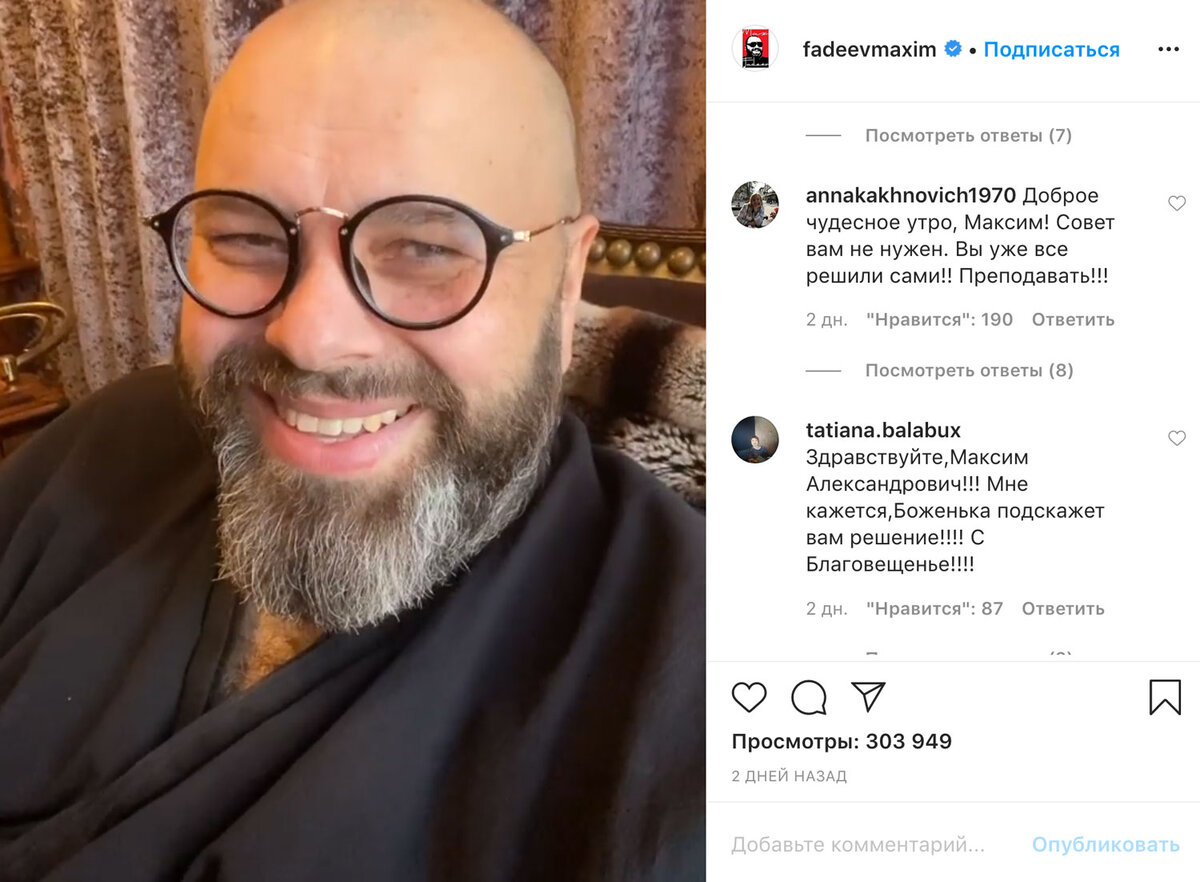 Можно как угодно относиться к Максу Фадееву, но нельзя не признать, что он безумно талантлив. Да к тому же тот еще интриган (чего только стоил роспуск MALFA)! Артисты, находясь на карантине, по-разному развлекают себя и нас. Фадеев, как всегда, подошел к этому креативно и патриотично одновременно, а именно – призвал всех артистов (и не только) исполнять песни наших дедов и прадедов: «Обращаюсь ко всем – артистам, простым людям! Давайте петь песни наших дедов и прадедов, наших бабушек и мам! Выкладывайте – так же, как я – и просто помогайте своим настроением каждому, кто рядом! Мир вам и вашему дому!» Также продюсер поведал о том, что получил заманчивое предложение преподавать в одном из московских вузов, открыть свой класс по вокалу. Сообщив, что решение еще не принято, попросил совета у подписчиков, заметив при этом, что если оно будет со знаком плюс, то летом он будет набирать свой класс. Под постом развернулось бурное обсуждение, и лишь одна подписчица словно прочитала и озвучила на