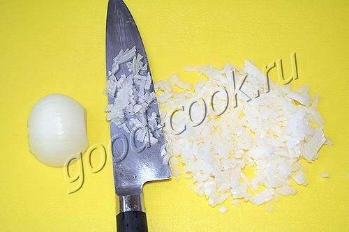 Лук нарезать как можно мельче. В сковороде разогреть растительное масло и выложить лук. Обжаривать на самом маленьком огне при периодическом помешивании до мягкости и лёгкого изменения цвета. До зажаривания не доводить. Пока тушится лук, подготовить