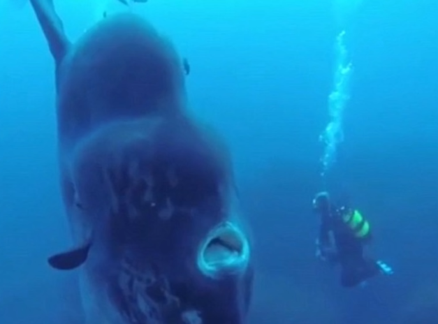 Самая большая в мире костная рыба – Солнечная рыба Худвинкер. Дайвер рядом для сравнения, чтобы вы поняли, насколько внушительны ее масштабы.