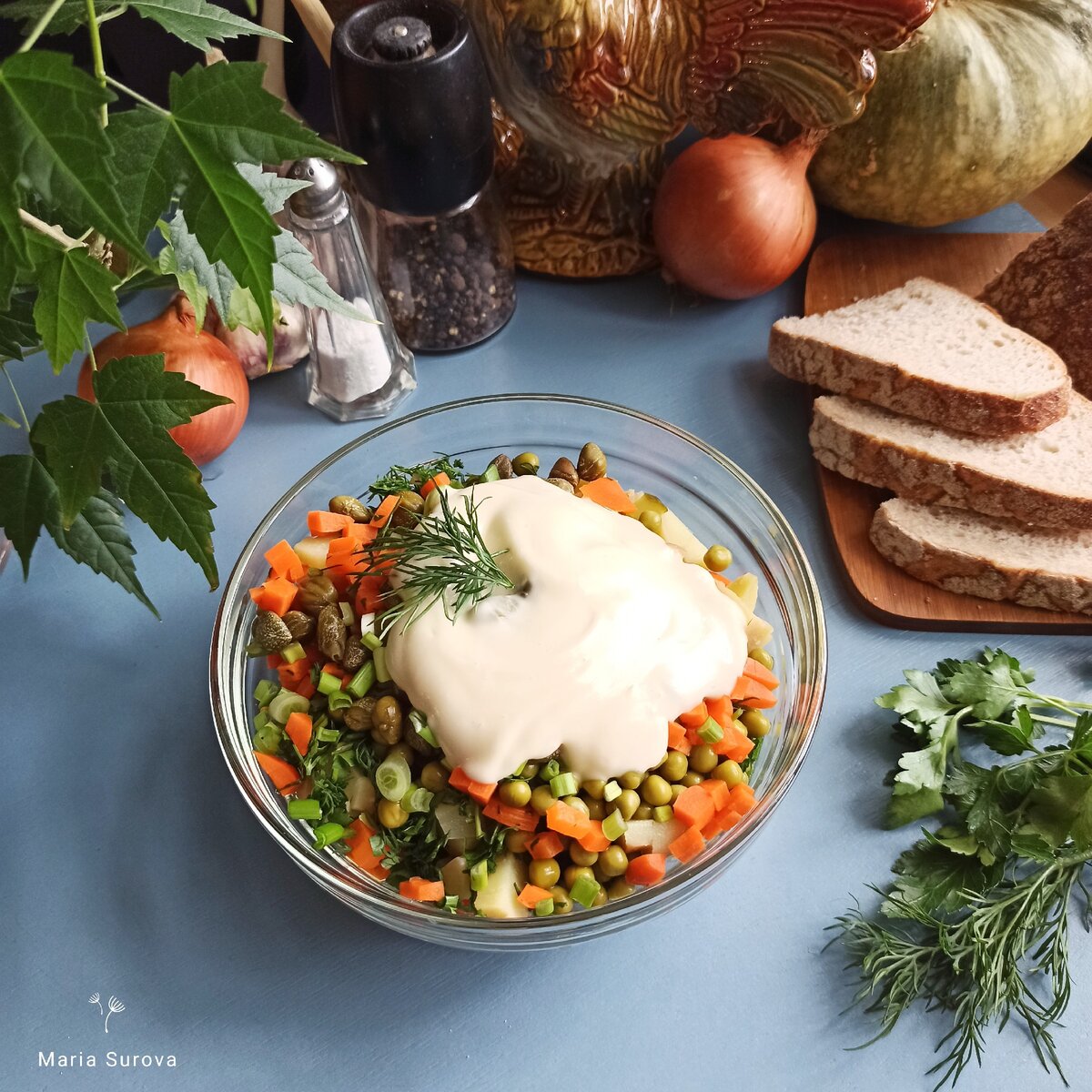 Мы очень любим такой постный картофельный салат, сытный и вкусный, как оливье, только без яиц и мяса, с домашним постным майонезом. Мне нравится, что ингредиенты для него нужны самые простые. Я готовлю разные варианты этого салата. Постоянные ингредиенты – отварной картофель, отварная морковь и зелёный горошек. Из солений подойдут - маринованные или соленые огурчики, каперсы, квашеная капуста, или даже зелёные оливки. Я режу мелко и добавляю немного солений – примерно пятую часть от общей массы овощей. Например недавно огурцы закончились, но осталось немного каперсов и половинка красной луковицы - получилось отлично! Можно добавить жареные шампиньоны, тоже вкусно получается! Зелень любая, какая есть – петрушка, укроп, зеленый лук или сельдерей. Можно нарезать репчатый лук – обычный или красный! Соотношение продуктов довольно свободное - так что экспериментируйте на здоровье! Ингредиенты: Приготовление: Картофель и морковь помыть и отварить в кожуре 20-25 минут. Охладить и почис