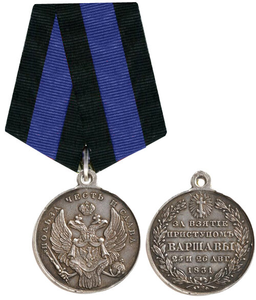 ЦАРСТВОВАНИЕ ИМПЕРАТОРА НИКОЛАЯ I ПОЛНОЕ СОБРАНИЕ ЗАКОНОВ РОССИЙСКОЙ ИМПЕРИИ СОБРАНИЕ I (выписка) (том VI Отделение 2. 1831 г.) 5042. - Декабря 31. Именной, данный Управляющему Главным Штабом. - Об установлении медали в воспоминание покорения Варшавы. В ознаменовании заслуг, оказанных Армией Нашей в продолжении военных действий противу Польских мятежников, Я признал за благо возложить на всех чинов ее, непосредственно в сих действиях участвовавших, принадлежащий Царству Польскому знак отличия за военные достоинства, и, сверх того, установить особую на ленте того же знака отличия медаль в воспоминание покорения Варшавы.Раздачу сих знаков отличия и медали установляю на следующих основаниях: 1. На получение Польского знака отличия за военные достоинства, на пять степеней разделяемого, имеют право без изъятия все строевые чины войск, в действительных сражениях противу Польских мятежников в пределах Царства Польского находившиеся. 2. Из нестроевых чинов, тем войскам принадле
