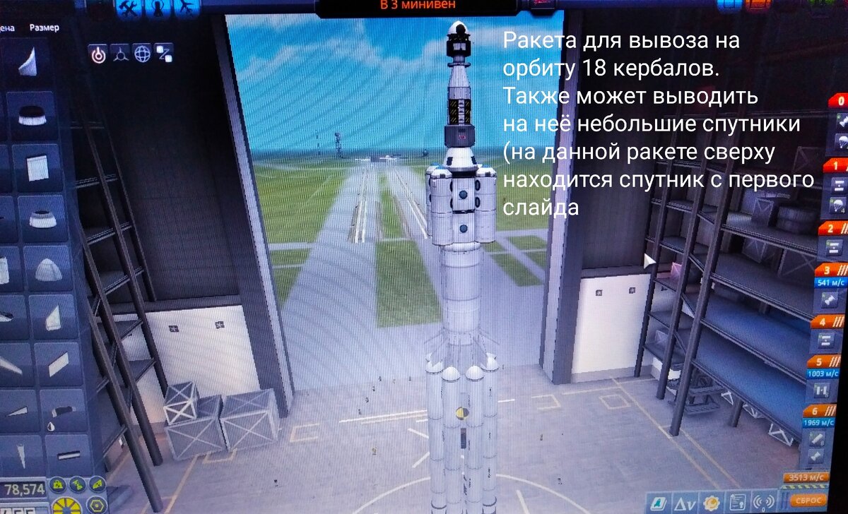 После запусков туристов на суборбиту Кербина прошло довольно много времени.К нам в компанию стало поступать намного больше контрактов на полёт от местных богачей. Но,запросы кербалов после выхода нашего пилотируемого аппарата на орбиту и удачного схода с неё и приземления сильно выросли,хоть оплата полётов и поднялась вместе с их требованиями.И всё же,кербалы-туристы являются огромным лакомым кусочком для нашей компании,поэтому все контракты на вывоз туристов не дальше орбиты Кербина всегда принимались. За определённый период времени собралось аж 17 Кербалов-туристов.И тут у меня возникла идея:почему бы не построить ракету,выводящую на орбиту их всех сразу.Получившийся шедевр и полёт на нём вы сможете увидеть далее: Конструкция ракеты.Сверху приделан небольшой ретрансляционный спутник,отделяющийся от ракеты в космосе Перейдём к полёту этой бандуры Тем временем,масса выводимого груза всё сильнее увеличивается..... Выход спутника на более высокую орбиту Кербина Масса посадочного моду