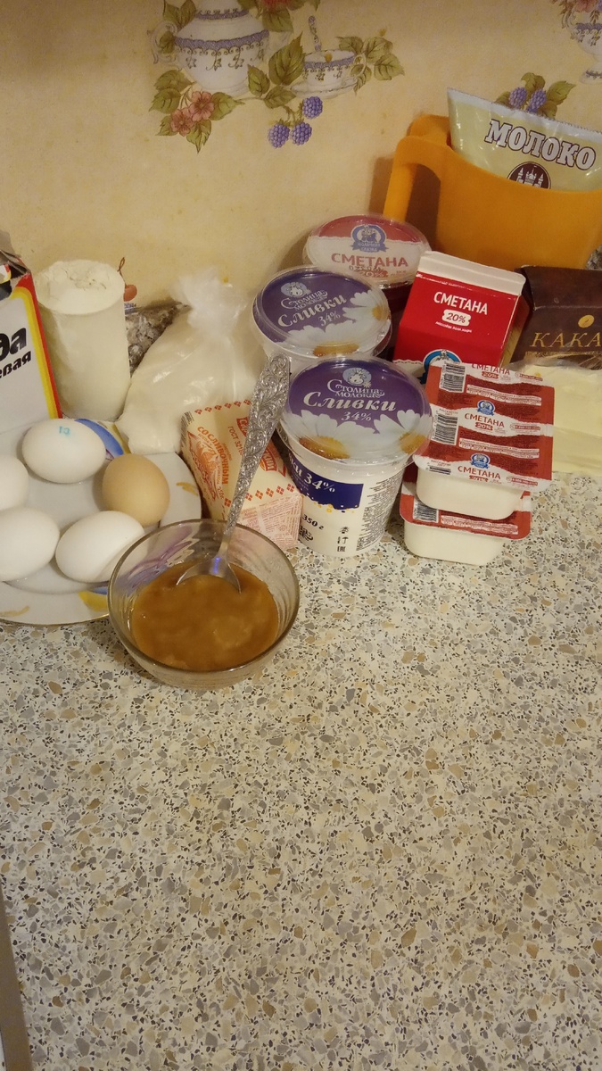 Очень давно наши бывшие соседи научили этому рецепту. Особенность торта - это то, что он всегда получается, даже, если сливки не удается достать домашние. Для теста: нужно 3 яйца, если крупных то 2, 0,5 стакана сахара, 100 г маргарина, 2 ложки с горкой меда, 1 чайная ложка с горкой соды и муки столько, чтобы тесто можно было брать руками, но чтоб липло к рукам. Для крема: 1 литр домашних сливок, у нас были магазинные, неполный стакан сахара. Для глазури: 1, 5 ложки столовые какао, 1 стакан сахара, 2 столовые ложки молока, 150 г сливочного масла. Мы готовили двойную норму - поэтому продуктов брали в два раза больше. Ставим воду греться в большой кастрюле. Пока греется смешиваем порубленный маргарин, яйца, сахар, мед и соду для теста. Ставим на водяную баню, как вода закипит и интенсивно мешаем, чтобы яйца не сварились, но маргарин растворился. Когда маргарин растворится - мешаем медленнее и смотрим - если все покроется пенкой - сразу снимаем с огня. Сразу добавляем муку . Должно пол