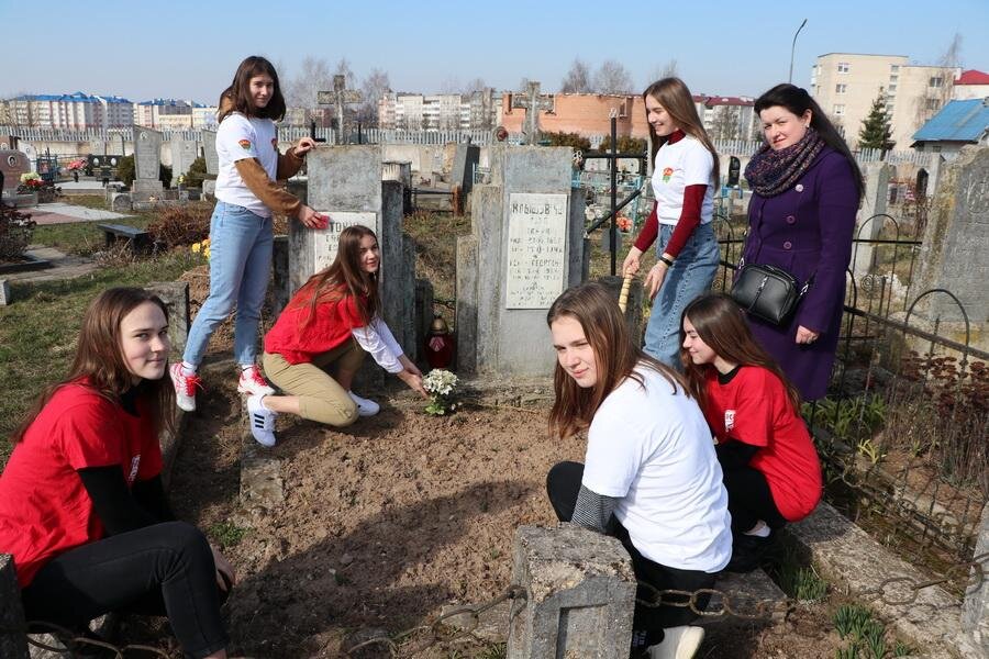 Ученики СШ №3 г. Щучина приняли участие в районном субботнике. Вместе с учителем английского языка, секретарём первичной школьной организации ОО "БРСМ" Марией Сергеевной Букиной они отправились на места захоронений жертв войны, чтобы навести там порядок. На городском кладбище по улице Титова ребята ухаживают за захоронениями, где нашли свой последний приют погибшие в годы Великой Отечественной войны Сергей Георгиевич Токть, Павел Михайлович Шляхтун, Язеп Иванович Клышевич и его сын Георгий, а также воин-интернационалист, воевавший в Афганистане, Константин Фёдорович Фалькович. -- Мы часто приходим сюда вместе с ребятами, -- говорит Мария Сергеевна. – К этой миссии – содержать воинские захоронения в чистоте – они относятся с особой ответственностью. И на этот раз ученицы 10 и 11 классов, члены "БРСМ" Арина Дубиневич, Анастасия Парфинович, Александра Ивановская, Виолетта Нестер, Елизавета Воеводкина и Татьяна Лазовик вооружились всем необходимым, чтобы навести порядок. На каждой из мог
