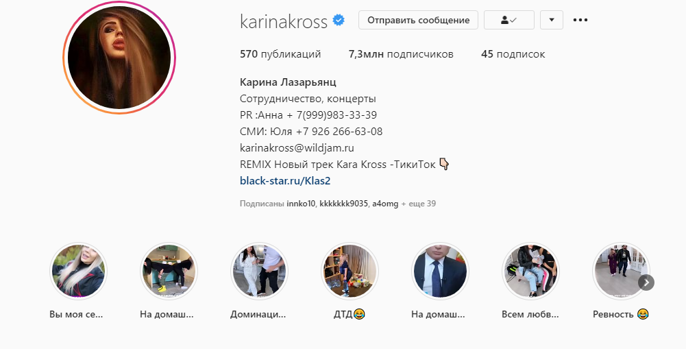 Всем привет сегодня мы поговорим о интересной и смешно девушку Карине Лазарянц или как её называют в инстаграм Карина кросс.Как мы видим это смелая девочка имеет 7.3 миллиона подписчиков, что очень даже много. Кто она? У семьи Лазарьянц родилась девочка, которую назвали Карина.С детства её тянуло стать актрисой.К шести годам она уже знала сказку о царе Салтане наизусть. После немного повзрослев, маленькая девочка увлеклась боксом.И к 14 годам получила второй разряд.Окончив школу она ходила на модельные курсы, что и помогло ей стать известной.Её позвали сниматься в универе, интерны и молодежка, что дало ей огромную популярность. Чем она занимается теперь? Карина стала успешным блогером, певицей и ведёт инстаграм с 7.3 миллионами подписчиков. Личная жизнь? В самом начале Карина встречалась с Александром Соколовским, но отношения длились немного.Она утверждает, что они не сошлись с характером. После она встречалась с Давидом. Они казались очень хорошей парой и вряд ли они должны были ра
