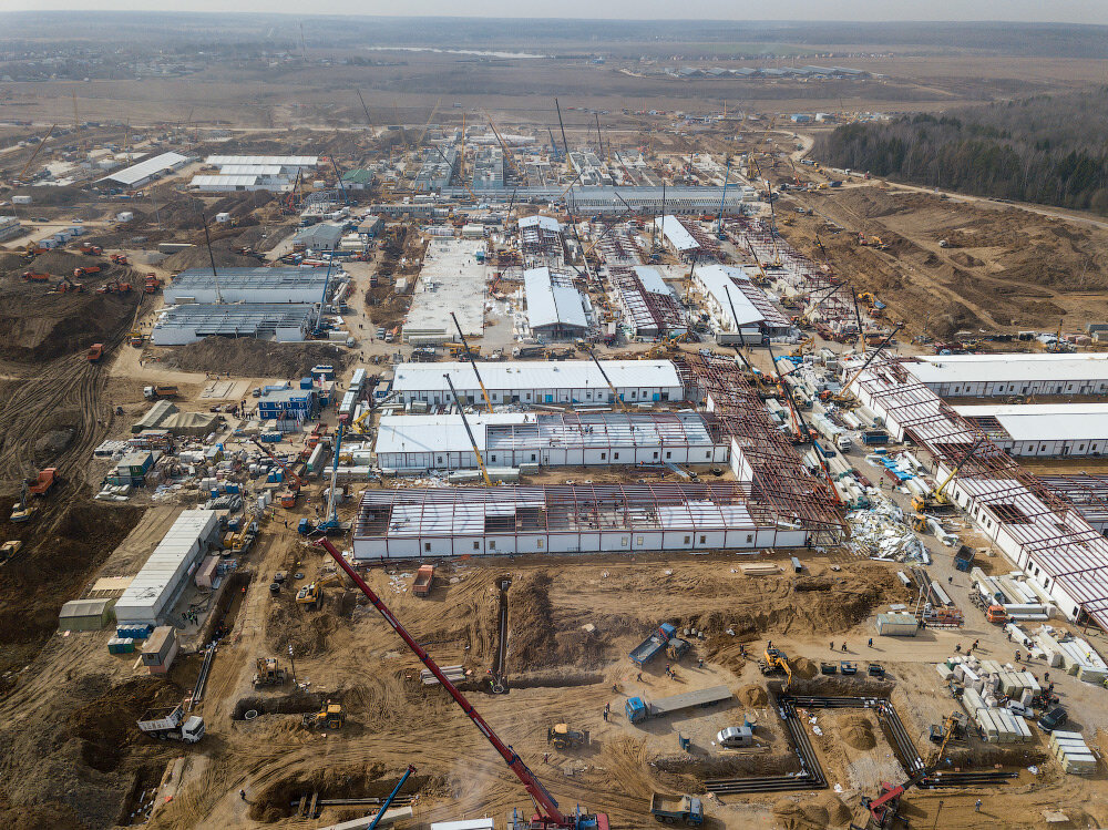 Приведу слова Сергея из Ватфора: ««Коронавирусная» больница — сейчас стройка номер один в России. По размаху она сопоставима с Крымским мостом: семь тысяч рабочих, больше тысячи единиц техники. Квадратный километр поля на границе с Калужской областью превратился в круглосуточный муравейник. Шоссе перекрыто для сквозного проезда и запружено транспортом, относящимся к стройке. Размах работ и количество людей понятны по огромной стоянке машин, которая заняла поле напротив.