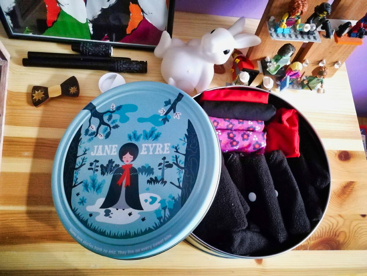 ~ хранение не требует никаких особенностей. Можно хранить в сложенном и разложенном виде, в любом удобном месте. Кто-то использует ящики для белья, у меня туда не влезало, зато нашлась красивая банка с уместной Джейн Эйр на крышке, я пользуюсь ей.