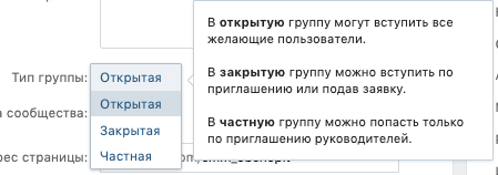 Тип «группа» подходит для небольших групп по интересам, не требующих широкой огласки (маленькие компании, группы одноклассников и т.д.).