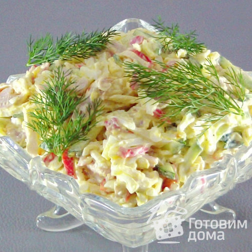 Предлагаю вам интересный, пикантный салат к праздничному столу. Необычный состав и отличное сочетание продуктов. Очень вкусное блюдо на Новый Год или Рождество. Обязательно попробуйте. Очень вкусно. ИНГРЕДИЕНТЫ Крабовые палочки нарезать соломкой и добавить к яйцам. 2.С копченого окорочка удалить шкурку и нарезать мясо на произвольные кусочки. ( шкурку и кости не выбрасываем...варим вкусный гороховый суп) 3.Огурец нарезаем соломкой и добавляем к остальным ингредиентам. 4.Добавляем по вкусу черный перец и сухой чеснок ( я добавил сухой, а можно и свежий) и перемешиваем. 5.Добавить майонез и хорошо перемешать. 6.Выложить в тарелку 7.Украсить зеленью Приятного аппетита! Пишите комментарии, ставьте лайки и подписывайтесь!