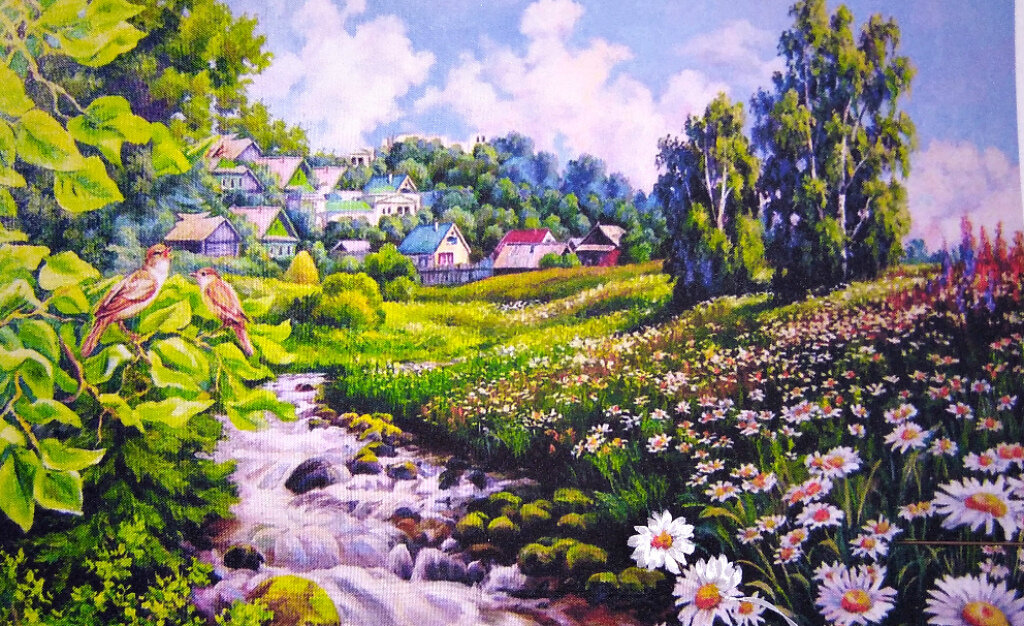 60 раз туда-обратно на одном квадратном сантиметре иголкой с одной ниточкой мулине – 60 французских узелков. Маленький кустик готов. Как не полюбить его после таких трудов? Неделю назад начала свой первый пейзаж. Думаю, половина работы готова. В черновом варианте, конечно. Что-то нужно будет подкрасить, что-то закрепить, где-то довышить. Начала с ромашек и окружающей мелочевки: травинки, лепестки, листочки. Затем двинулась выше – к домам. Контурной вышивкой придала им объем, обозначила окна, трубы, заборчики. Вот тут-то и подоспели кусты. Среди них затерялся стожок сена. Те, которые на переднем плане, делала французскими узелками. Плотно. Вроде, и места немного занимают, а понадобилось 9 цветов ниток мулине – так много оттенков зеленого нужно было передать. А вот и береза. Красавица наша. Обожаю ее. К сожалению, в Интернете очень мало советов, как вышить ее лентами. Помогли подсказки моего учителя, Народного мастера Людмилы Ташбаевой. Стволы – настил из мулине, который затем обши