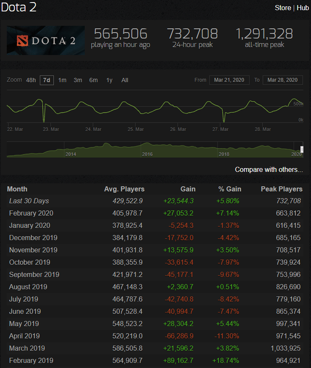 Пиковый онлайн в Dota 2 за последние 30 дней достиг отметки в 732 706 пользователей. Это лучший показатель MOBA от Valve в 2020 году. Данные предоставил портал Steam Charts. Прошлый рекорд был зафиксирован 14 марта. Тогда в Dota 2 одновременно находились 692 тыс. игроков. Лучший показатель за всю историю MOBA установила в марте 2016 года — на тот момент пиковый онлайн составил более 1,291 млн пользователей. Ранее рекорд онлайна обновила Counter-Strike: Global Offensive. 22 марта в шутер одновременно играли более 1,1 млн человек.