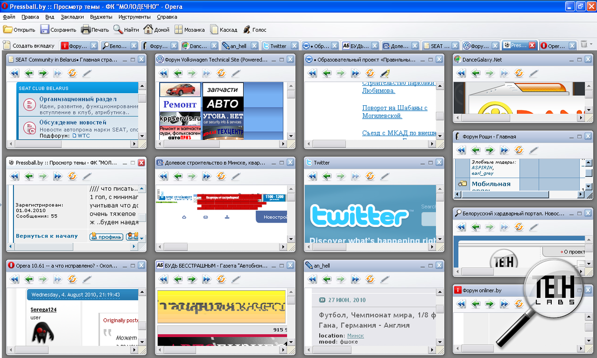 Начало здесь Продолжая издеваться над браузерами, нагружая их тремя сотнями вкладок в прошлый раз мы выяснили, что Опера показала тормоза в видео, а Хром вовсе не пришёл к финишу. Пришла очередь “Огнелисы”. Firefox Началось всё чинно и размеренно. Firefox открывал вкладки одну за одной потребляя при этом меньше ресурсов, чем Хром, но больше, чем Опера. Казалось, что всё хорошо, правда неспешно, не было того азарта, того блеска в алгоритмах. Хотя стоп, блеск был. У Лисы в панели вкладок есть кнопки прокрутки, благодаря чему, во-первых, ширина вкладки не падае6т почти до одного пикселя, а во-вторых, этот самый блеск и можно наблюдать на границе первой / последней вкладки и кнопки прокрутки. Ближе к концу, примерно на 250-280 вкладке всё пошло не по плану. Firefox открыл второе окно и стал открывать там вкладки с очень странным содержимым. Где-то просто набор символов, из которых трудно было что-то понять, где-то папка на локальном диске, а где-то и вовсе ничего. Открытые же правильно п