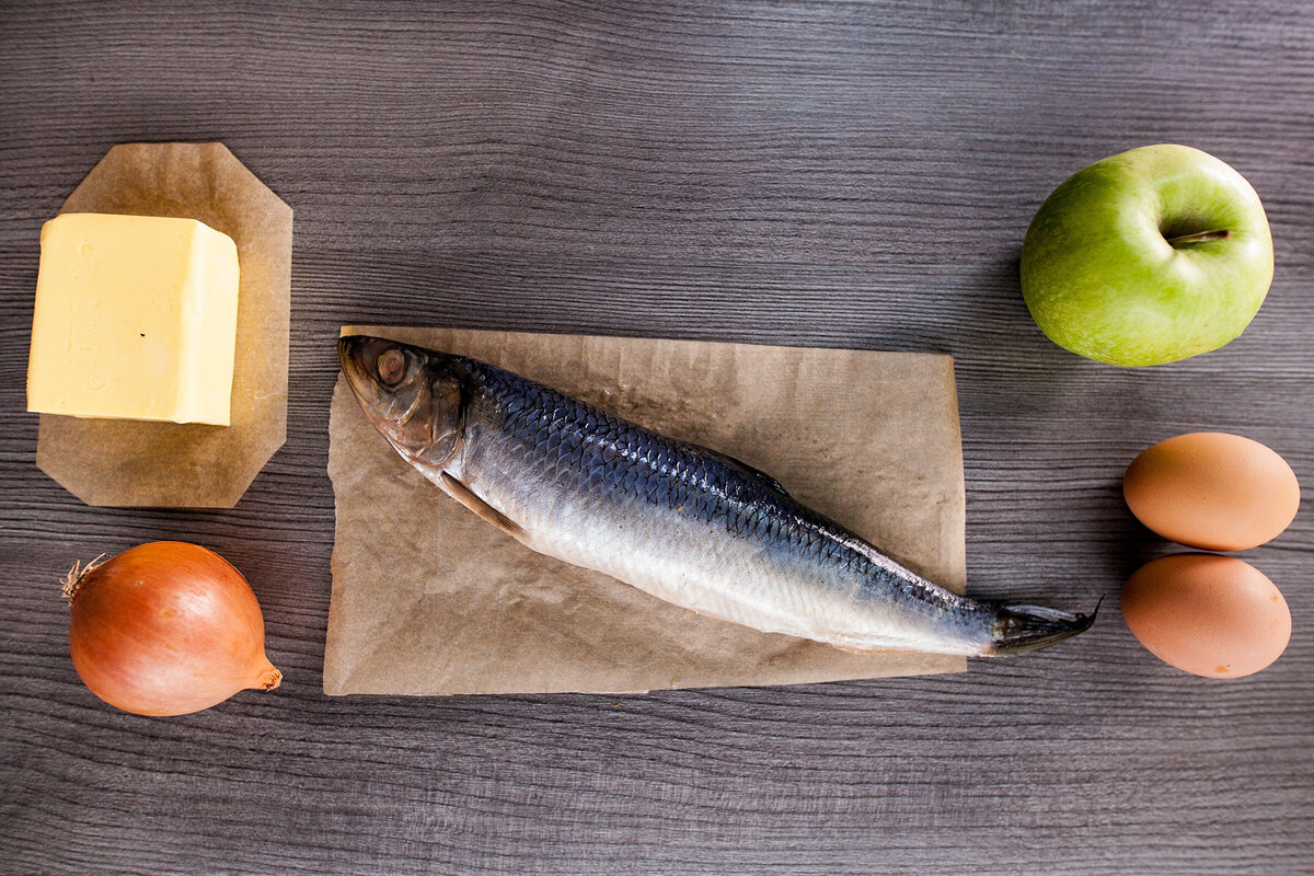 Сельдь целая (солёная) 300г Сливочное масло 30г Яйца 2 шт. Яблоко зелёное 1 шт. Репчатый лук 1 шт. Ржаной хлеб 1 ломтик Приготовление: Сервировка: