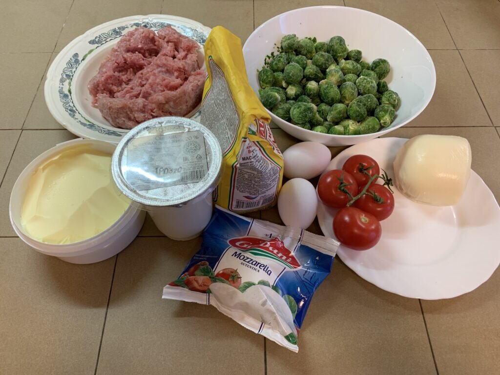 Ингредиенты: Для теста: Для начинки: Для заливки: Способ приготовления: Для начала приготовим тесто. Выложите сливочное масло в миску и растопите его в микроволновой печи до жидкого состояния. А затем смешайте его с целой пачкой сметаны. В полученную смесь добавляем сухие ингредиенты – щепотку сахара и соли, пачку разрыхлителя (1 ст. ложка), а затем и муку. Её добавляйте небольшими порциями и вымешивайте всё это сначала лопаткой, а потом руками. Тесто должно получиться очень мягким и эластичным, не прилипать к рукам. Скатайте из него шар. Теперь достаньте форму для запекания и начните распределять его по основанию и бортикам. Разминайте его равномерно по всему пространству. Бортики полностью должны быть скрыты тестом, чтобы начинка потом не вываливалась. Затем отправьте форму с тестом в холодильник на 10-20 минут. Теперь приготовим начинку для киша. Отварите брюссельскую капусту до готовности. Фарш из индейки смешайте с солью и приправами, например, с прованскими травами или паприкой.