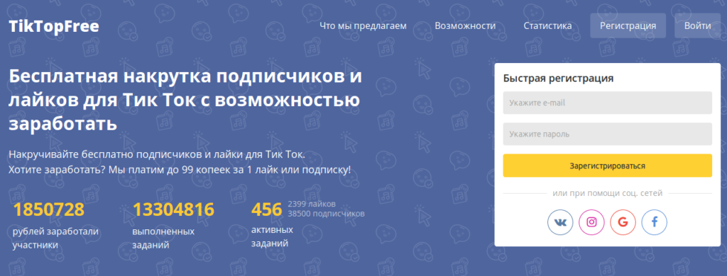 В данный момент Тик-ток является самой недооцененной социальной сетью. Одно видео может набирать по 3 миллиона просмотра за 1 день. Конкретных алгоритмов защищающих от блокировки в Тик-токе еще не придумали, поэтому можно спокойно накручивать подписчиков, лайки и просмотры. Ниже приведены актуальные сервисы, без ботов с живыми людьми. Tiktop-free Сервис специализируется на накрутке и заработке только в ТикТок. Деньги на счет зачисляются сразу после выполнения задания и доступны для вывода на QIWI, Webmoney и Яндекс.Деньги. Кстати, на сервисе предусмотрены штрафы за отписки и снятие лайков. Поэтому советую быть честными. Vktarget Многофункциональная платформа. Здесь можно зарабатывать на активности в любых социальных сетях, в том числе и в ТикТок. Вырученные деньги становятся доступны для вывода в течении двух дней после подачи заявки. UNU Сервис работает по аналогии с предыдущими. За выполнение примитивных действий на счет исполнителя начисляется денежное вознаграждение. Однако з