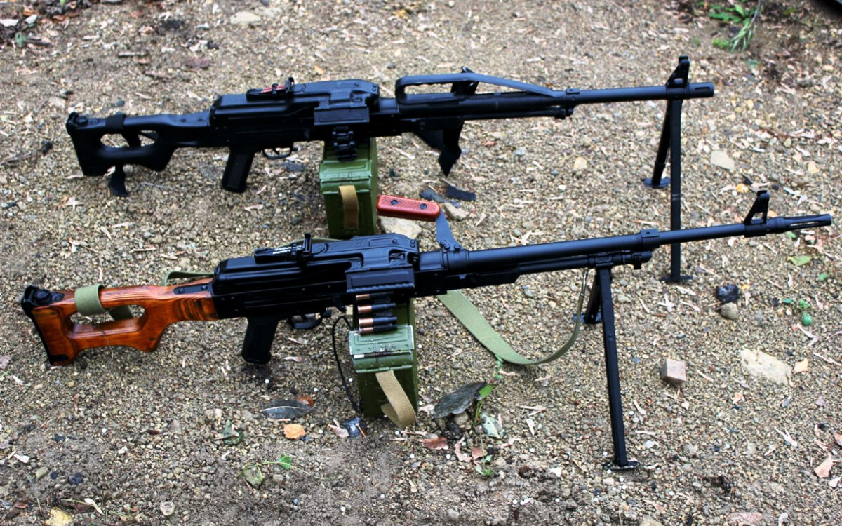 ПК. Пулемет Калашникова. Разработан данный пулемет в 1961 году. Позже ПК заменил ПКМ ТТХ: Масса 9 кг на сошках 16.5 на станке Длина 1173 мм Длина ствола 605 мм Калибр 7.62 мм Патрон 7.62×54 мм R Принцип работы: отвод пороховых газов Начальная скорость пули 825 м/с Прицельная дальность 1500м Вид боепитания: ленты на 100, 200 и 250 патронов Прицел механический Ресурс ствола 10000 выстрелов ПКМ. Пулемет Калашникова модернизированный Разработан в 1969 году. Является улучшенной версией ПК. В данном пулемете снизился вес с 9 кг до 7.5 кг Если из ПКМ произвести 400 выстрелов в высоком темпе, то придется заменить ствол, который шел в комплекте. ПКП "Печенег"-пулемет Калашникова пехотный ПКП является глубокой модернизацией ПКМ . Без изменений осталась только ствольная коробка В этом пулемете применяется система охлождения которая повышает ресурс ствола с 10000 до 30000 выстрелов. Сошки передвинуты ближе к пламегасителю, что значительно повышает устойчивость во время стрельбы.