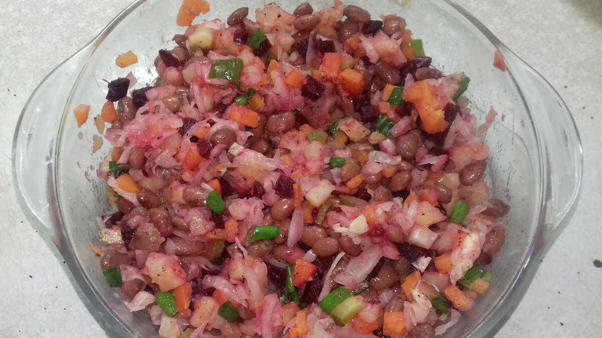 Всё перемешать, добавить фасоль. посолить, заправить маслом.