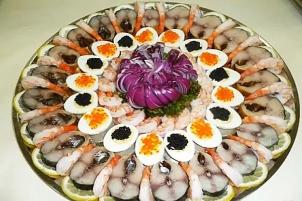 Для банкетов сельдь в компании с другими сортами рыб и морепродуктов включается в состав так называемой рыбной тарелки. В этом случае очищенную от потрохов и кожи тушку рыбы с отсеченной головой нарезают поперек хребта средними (0,7-1 см) ломтиками и раскладывают на блюде в определенной композиции. КЛАССИКА Лимон, зелень и лук – это самые популярные варианты декора рыбных тарелок, ведь все эти ингредиенты прекрасно сочетаются с рыбой. УКЛАДКА ВНАХЛЕСТ Еще один оригинальный способ подачи селедки — укладка нарезанных ломтиков сельди внахлест, поочередно, от головы к хвосту, по кругу на круглом блюде или вдоль на селедочнице, создавая на тарелке вид рыбки. Центр и края тарелки можно декорировать нарезанными и замаринованными кольцами лука, зеленью, свежими овощами, мини-закусками. Если стол сервируется для встречи Нового года, то можно сделать оригинальную елку из лимона. КОМБИНИРУЕМ Можно также сделать акцент на контрасте, если уложить сельдь вместе с красной рыбой. В данном случае лучше