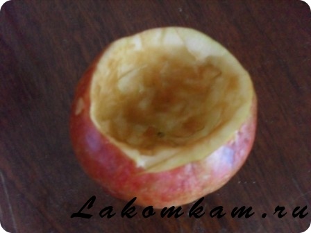 Десерт «Запеченное яблоко». Приготовление. 1. Яблоко вымыть, вытереть и вырезать серединку так, чтобы получилась чашечка с довольно толстыми краями.