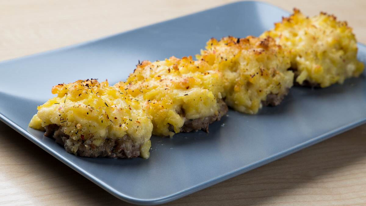 5. Выкладываем на котлетки картошку с сыром в виде горки