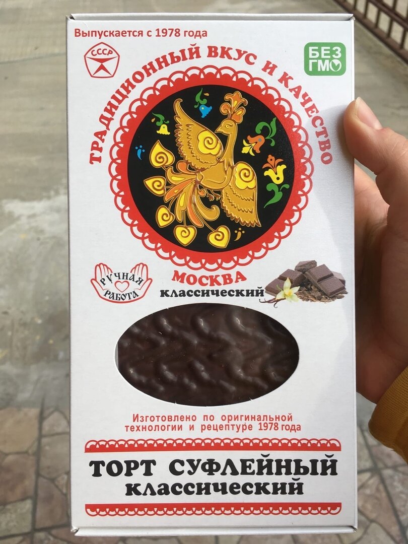 Бродя по очередному Магниту "У дома" в поисках каких-нибудь более менее не химозных вкусняшек, мы наткнулись на один очень любопытный экземпляр тортика. Конечно, в первую очередь я повелся на яркую этикетку, которая заставила обратить на себя внимание. Далее мы уже ближе подошли к витрине, где стояло это чудо, и принялись его рассматривать. То, что этикетка содержит надпись "Без ГМО", нас не сильно привлекла. Больше всего нас заинтересовали слова: "Выпускается с 1978 года" "Изготовлен по оригинальной технологии и рецептуре 1978 года" То есть всем своим видом они говорят, что делают его очень давно и: "Ау! Мы тут соблюдаем традиции СССР! Купи и узнай, если не веришь! Ну и конечно же, надпись "Ручная работа" вызвала большой интерес. Как это, торт, стоимостью 199 рублей может быть изготовлен руками, что это за труд-то такой. Возможно под "Ручной работой" имелось ввиду, что коробка для торта складывается вручную. Об этом история умалчивает. Далее нас очень заинтересовал состав данного т