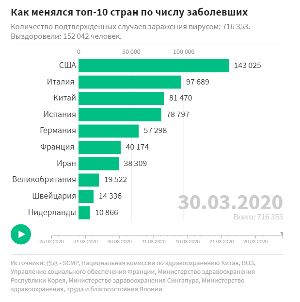 Лидером по числу подтвержденных случаев, по данным Университета Джонса Хопкинса, стали США (142,5 тыс.), которые обошли Италию (97,6 тыс.) и Китай (82 149). Следом идут Испания (80 110), Германия (62 435) и Франция (40 723).